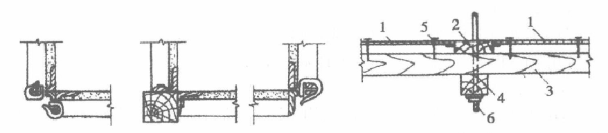 圖5一53L形外橋梁模板連接 圖5一54板同木楞用鐵釘螺栓連結(jié)剖面 1.鋼橋梁模板 1.立檔木.木拼板3.橫檔板.釘子6,固定螺栓